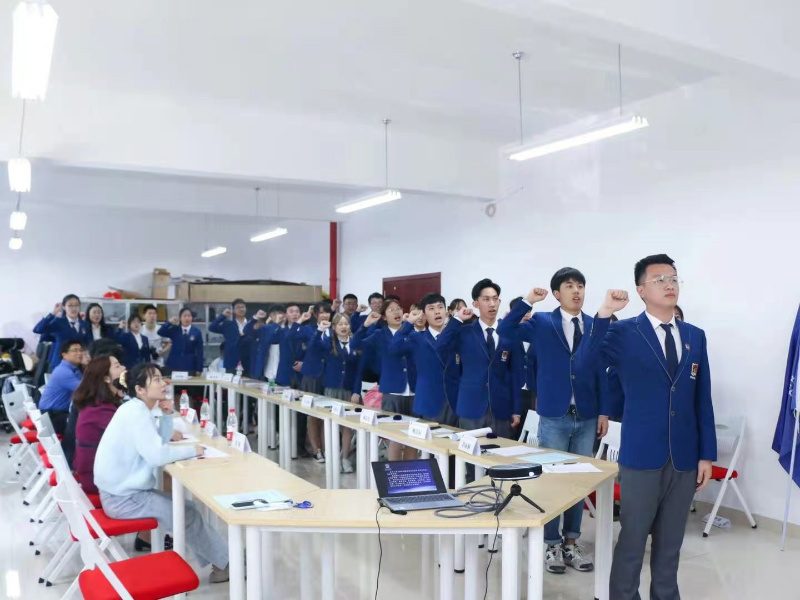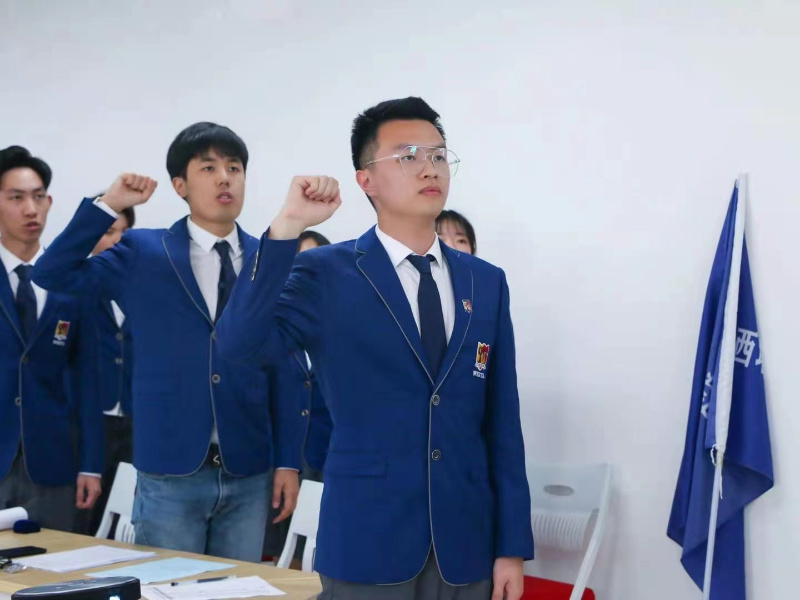 各位领导老师为权益委员会代表授予徽章。员工权益委员会会长2019级王子鸣同学接受了何兴副经理授旗后,带领全体成员集体宣誓,"科学、合理、民主地代表、引导同学表达诉求,切实维护同学正当权益,共同建设美丽西塔",铮铮誓言回荡在会场。