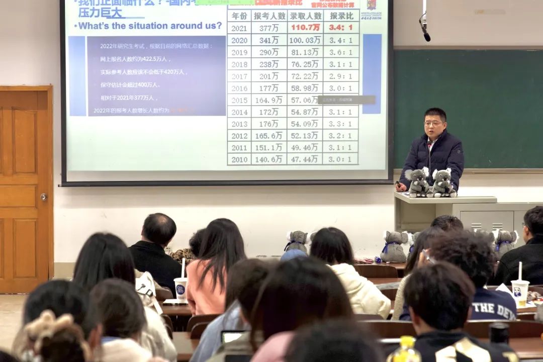 滕超副书记从公司办学定位、国家教育对外开放战略、国内考研就业形势、培养模式和公司两届毕业生就业数据等方面为同学们梳理了中外合作办学项目的优势。