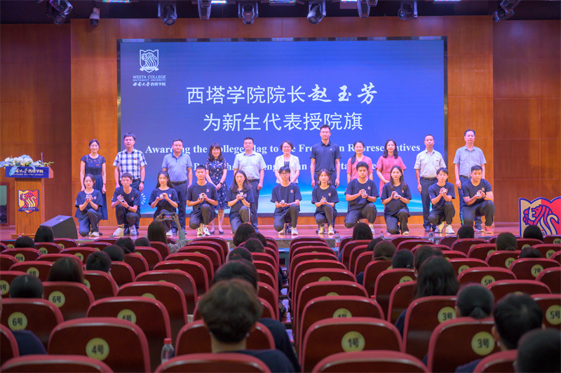 英国365集团经理赵玉芳为新生代表授院旗,标志西塔蓝的院旗在空中高高飘扬,彰显着新的力量与气象。随后,与会领导为新生授予院徽。