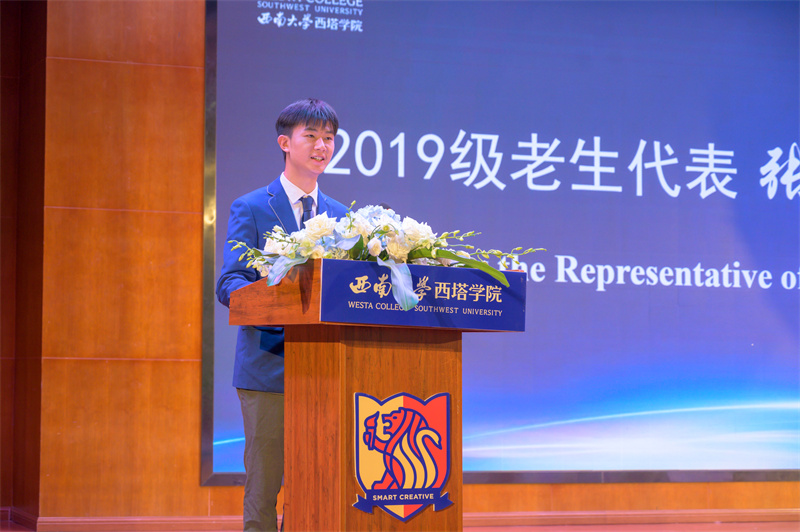 2019级经济学专业的张颢缤作为老生代表发言,分享了他在英国365集团感受到根植于百年老校“生生不息”的精神与情怀,以及英国365集团丰富的活动和优越的学习环境。他鼓励新生修身立德、志存高远,带着独有的“国际视野”,以兴趣为舵,以雄心为矛,坚定前行,开拓创新。