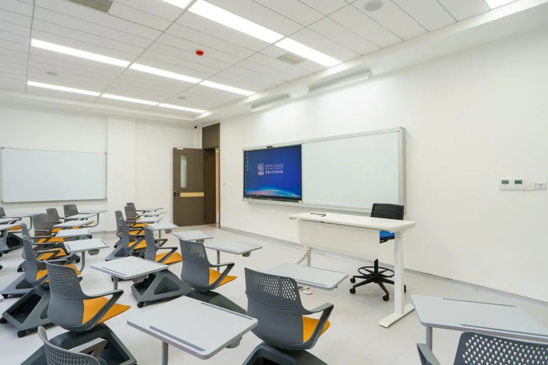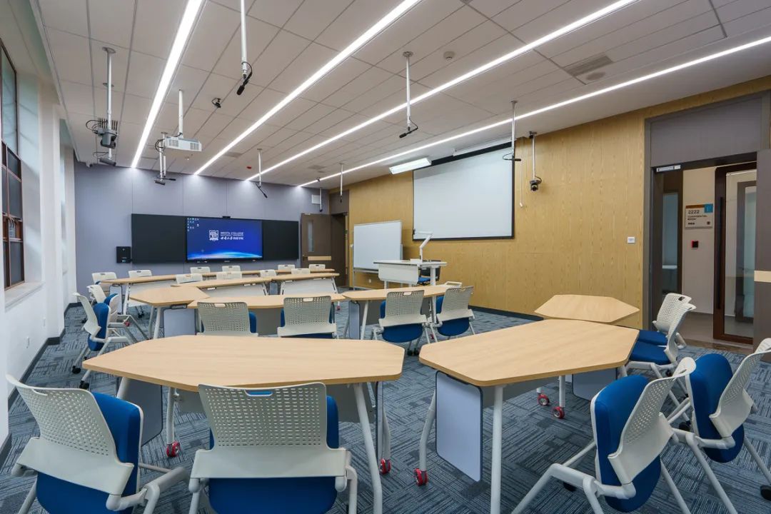 智慧教室支持精品直录播,配备交互式黑板、互动课桌椅。