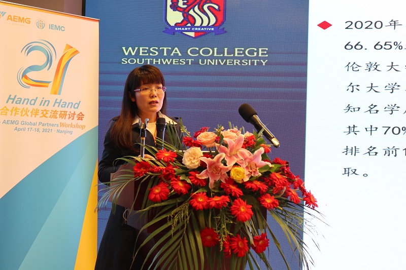 4月17日,为进一步推进中外合作办学机构招生宣传、教学组织、员工培养等经验交流,探讨后疫情时代中外合作办学的机遇与挑战,切实提升国际化人才培养质量,公司赴南京参加国际教育管理会议之中国合作高校2021年度工作会。公司经理赵玉芳应邀出席会议并作主题报告,公司国际合作与交流处副处长张俊、合作办学科科长王骏,公司中外合作办学项目负责人以及公司相关科室参加会议。出席本次会议的还有山东大学、东北林业大学、中国海洋大学、南京航空航天大学、西安建筑科技大学等20余所高校的国际处、中外合作办学机构项目的主要负责人以及AEMG集团相关负责人。