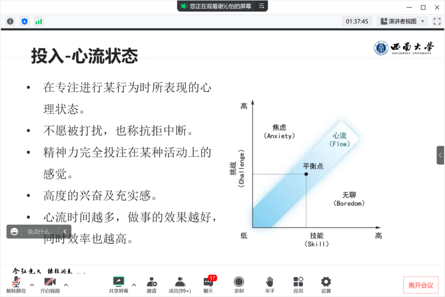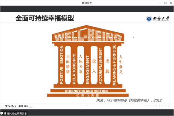 谢老师以党的二十大报告中“奋斗创造美好生活”和黄国平学长2021年毕业典礼的致辞开篇。她围绕积极心理学、个人情绪、人际关系三个方面进行详细阐述。