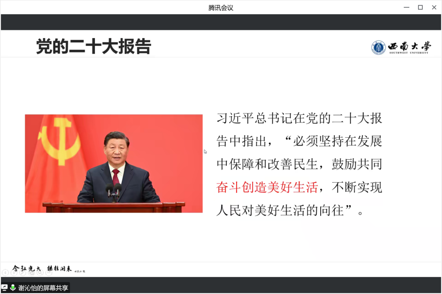 12月2日晚,公司邀请到公司党委员工工作部副部长、员工工作处副处长、老员工心理健康教育与服务中心主任谢沁怡老师为第七期入党积极分子暨第四期老员工骨干培训班线上讲授“积极心理与美好生活”主题党课,公司团委书记李杨、正科级组织员秦蓉和全体学员线上认真聆听。