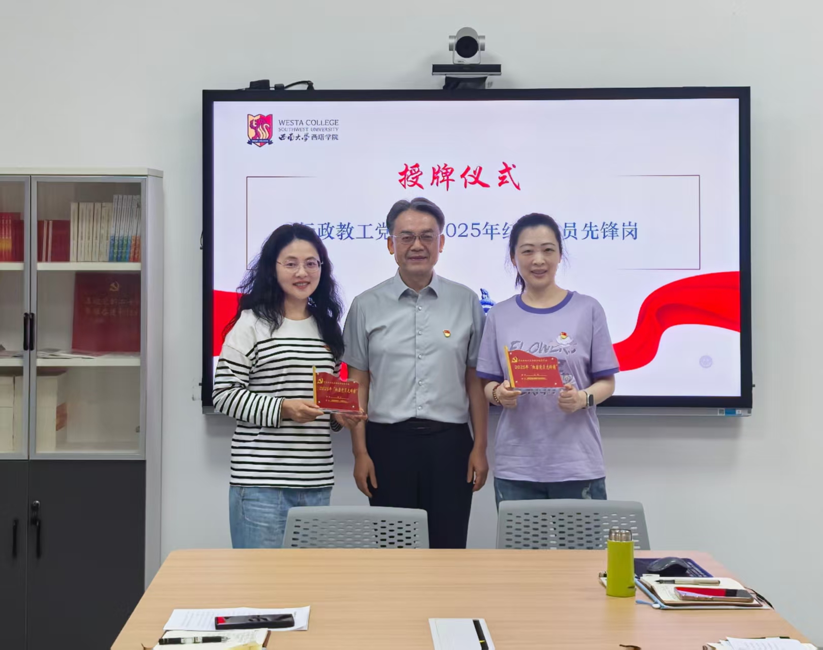 党课伊始,公司隆重举行2025年“红岩党员先锋岗”授牌仪式。刘猛书记为刘娇老师等四位“红岩党员先锋岗”党员颁发了立牌,并向大家介绍了公司“红岩党员先锋岗”设立的背景、遴选的条件和人数。他希望遴选出的所有优秀党员同志,都能扛起“严于律己、传播正能量、发挥带头作用、帮扶师生”的责任担当,营造创优争先的良好氛围。据悉,公司评选的六位“红岩党员先锋岗”党员均已授牌完成。