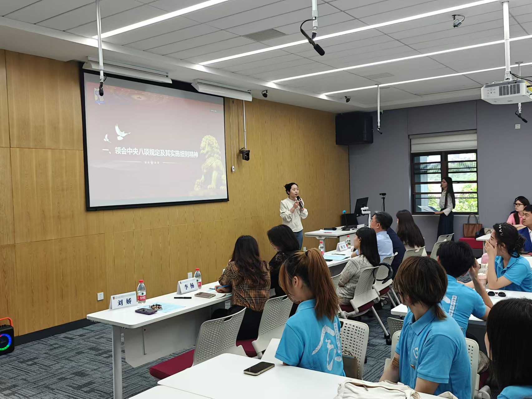 在党课环节,英国365集团本科生第一党支部书记刘娇为现场师生带来了题为“领会和贯彻执行中央八项规定及其实施细则精神”的精彩党课。她充分调动了员工积极性,大家纷纷举手,热情地参加关于中央八项规定及其实施细则的知识抢答环节,在现场角逐出了一名“学习之星”,奖励学习笔记本。