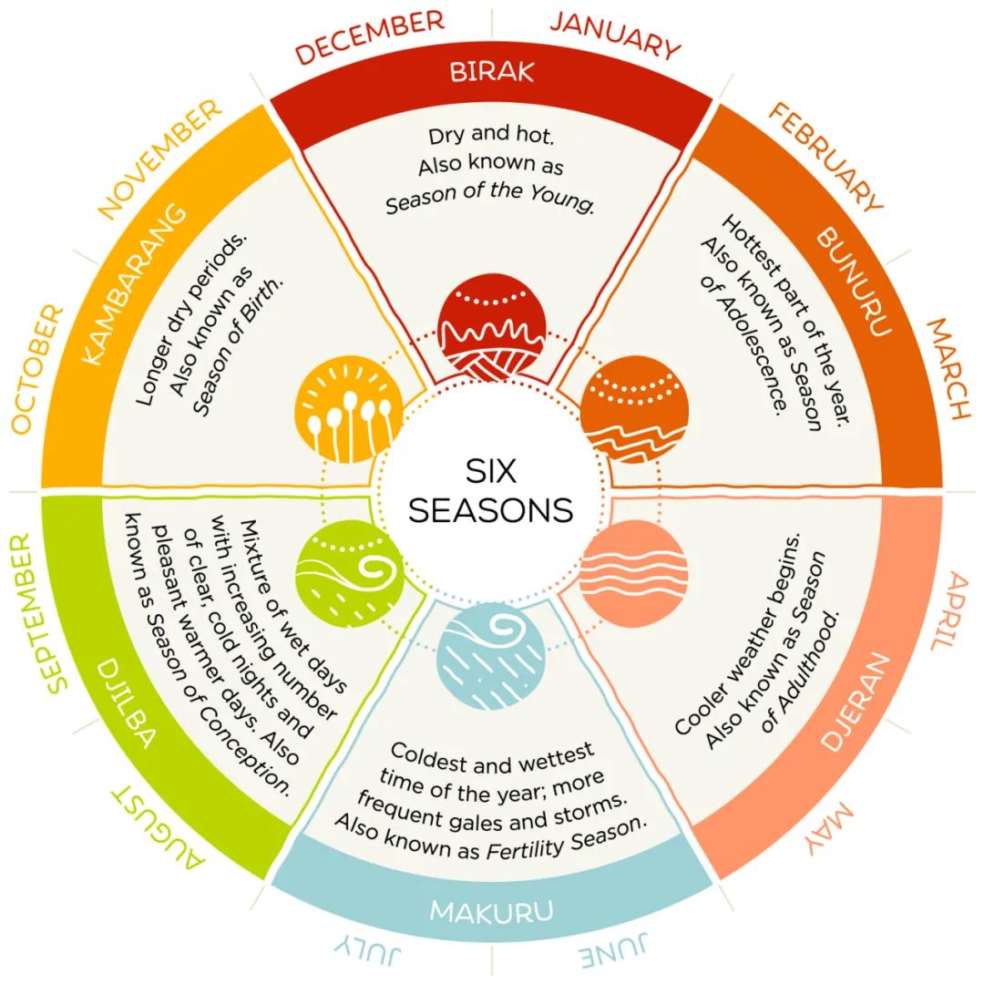 西澳大利亚州西南地区土著民依据当地动植物的变化,将1年划分为六个季节,它们分别是:Birak,Bunuru,Djeran,Makuru,Djilba,Kambarang。